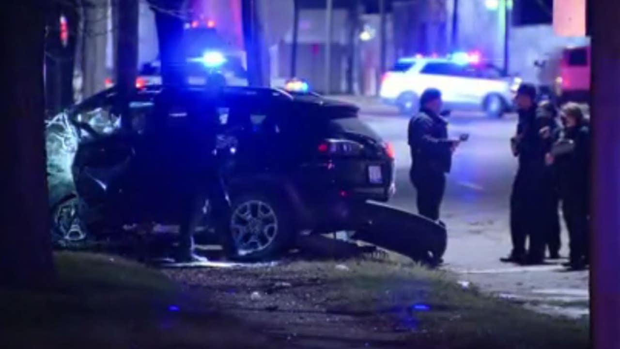 Three people including two Chicago police officers were injured in a crash Wednesday night in West Englewood on the South. A woman was killed and two others. Car crash April 1 2022 1054 pm.